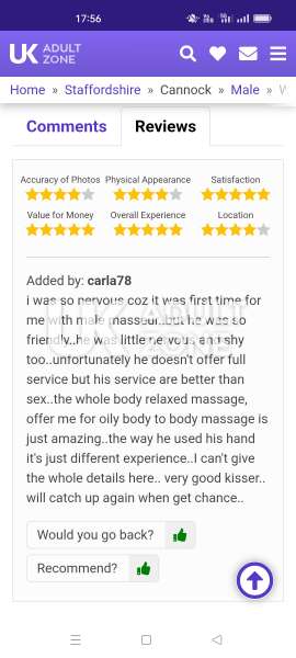 First with any male masseur.. bit nervous and worried about neighbours but he was enough discreet. excellent massage technique what exactly my body wanted.he ask me if I want oily body to body massage with hand relief.glad I said yes.not going tell the details but what a pleasurable massage service it was. I'll book you again when get chance. unfortunately he only do outcall.
